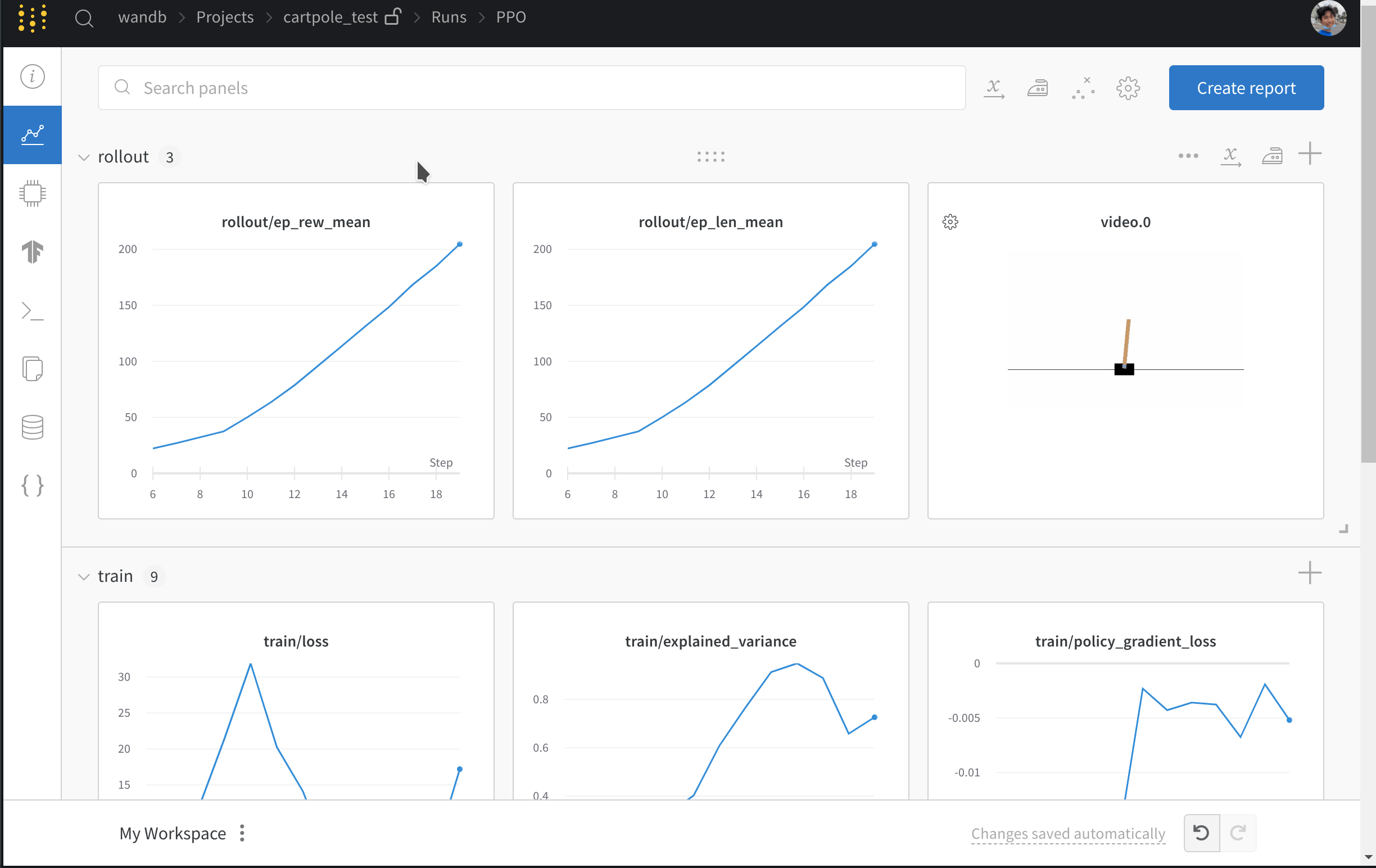 - 損失やエピソードごとのリターンなどのメトリクスを記録します。