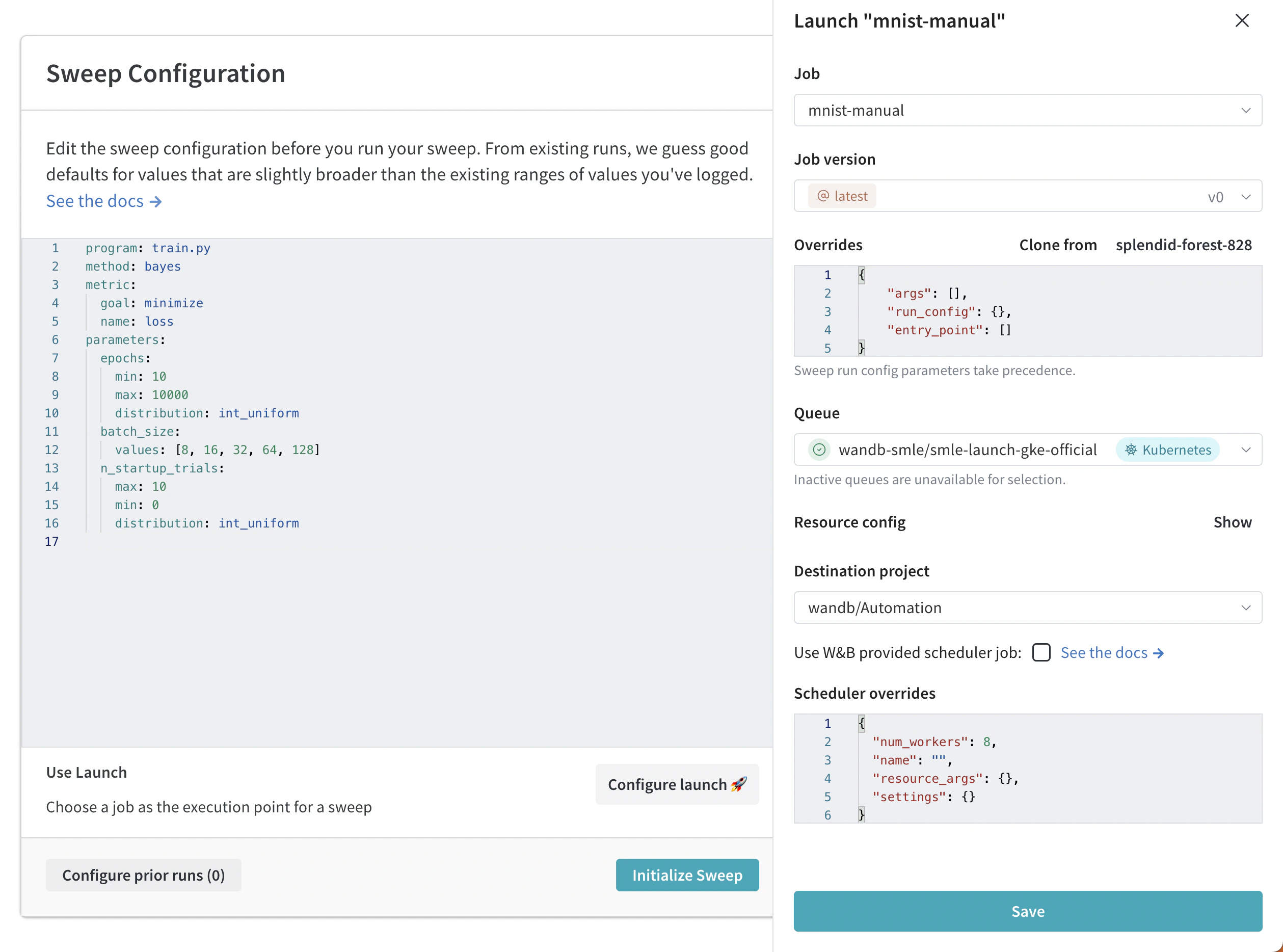 jobs/sweep_schedulers 아래의 wandb/launch-jobs 리포지토리에서 확인할 수 있습니다. 이 가이드에서는 공개적으로 사용 가능한 Wandb 스케줄러 작업을 사용하는 방법과 사용자 정의 스윕 스케줄러 작업을 생성하는 프로세스를 보여줍니다.
